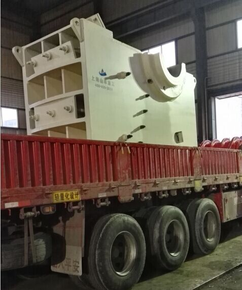這是上周上海山卓重工的顎式破碎機的發(fā)貨現(xiàn)場,這一臺設(shè)備是發(fā)往貴州六盤水的。這些照片都是小編用自己的手機隨手拍的,雖然光線不是很好,但也可以清晰的看到設(shè)備上我們上海山卓的標(biāo)志。這臺鄂破的型號是PE900*1200,屬于一個比較大的型號,它的進料口尺寸是900mm*1200mm,確實是一臺很大的設(shè)備!
